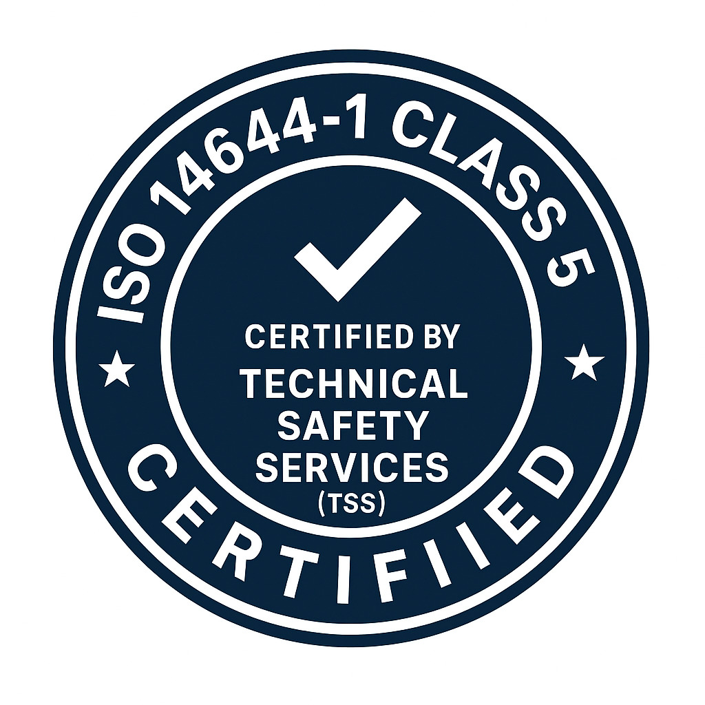 Our cleanroom is independently certified by Technical Safety Services (TSS), a nationally recognized provider of controlled environment testing. We meet ISO 14644-1 Class 5 standards, ensuring ultra-low particulate levels for critical production environments.